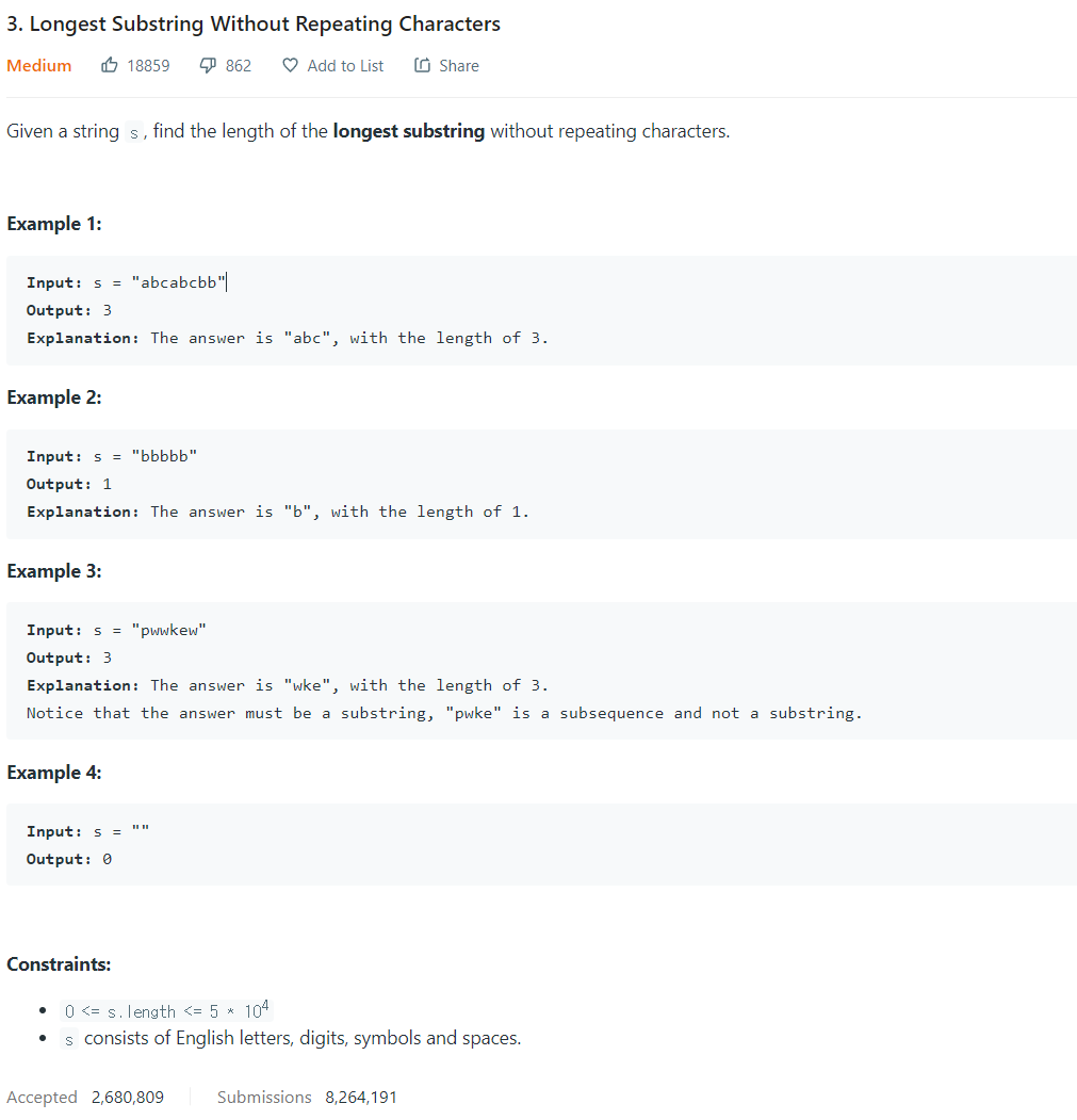 3. Longest Substring Without Repeating Characters