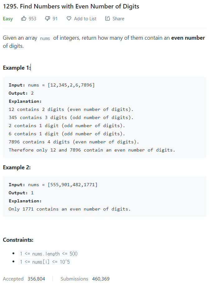 LeetCode 풀기 - 1295. Find Numbers with Even Number of Digits 본문