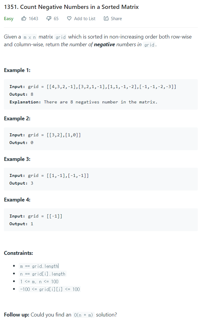 LeetCode 풀기 - 1351. Count Negative Numbers in a Sorted Matrix 본문