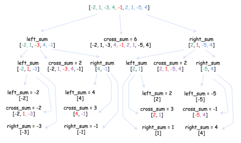 - max_cross_sum : 가운데((left+right)/2)에 걸쳐서 왼쪽, 오른쪽 subarray에 포함되는 영역의 최대 sum 값