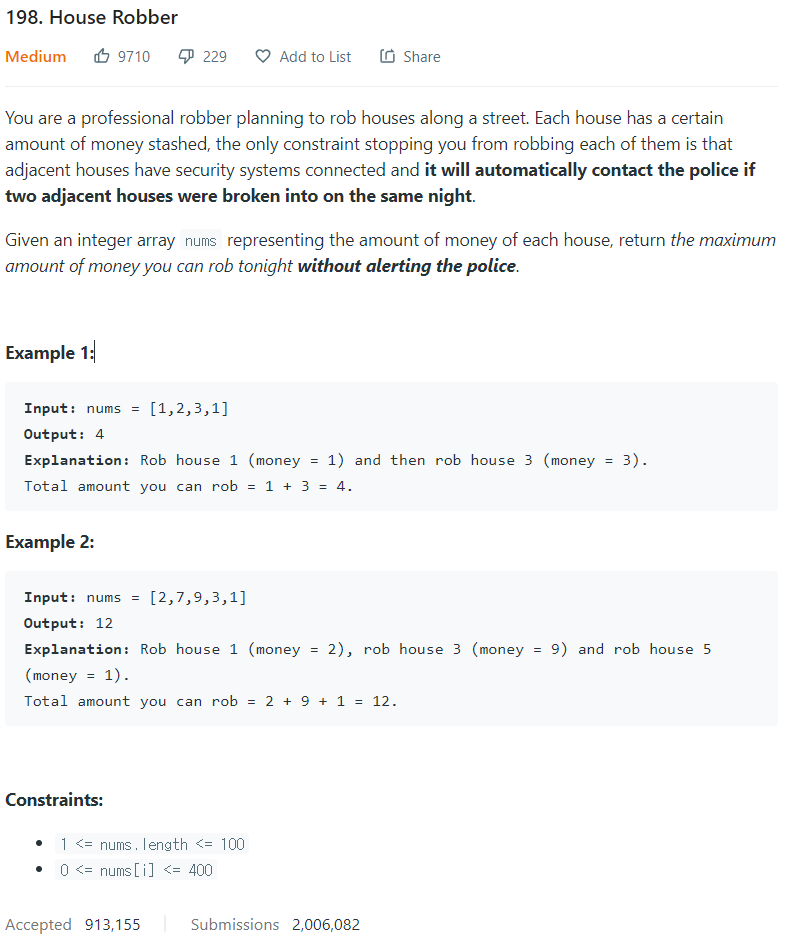 - 위를 조금 더 풀어서 설명하면, 도둑이 i번째 집에 있을 때 최대 값은 i-1번째 집까지 훔쳤을 때의 값이거나 or i-2번째 집에서 훔친 값과 i번째 집의 값을 더한 값 중 더 큰 값에 해당