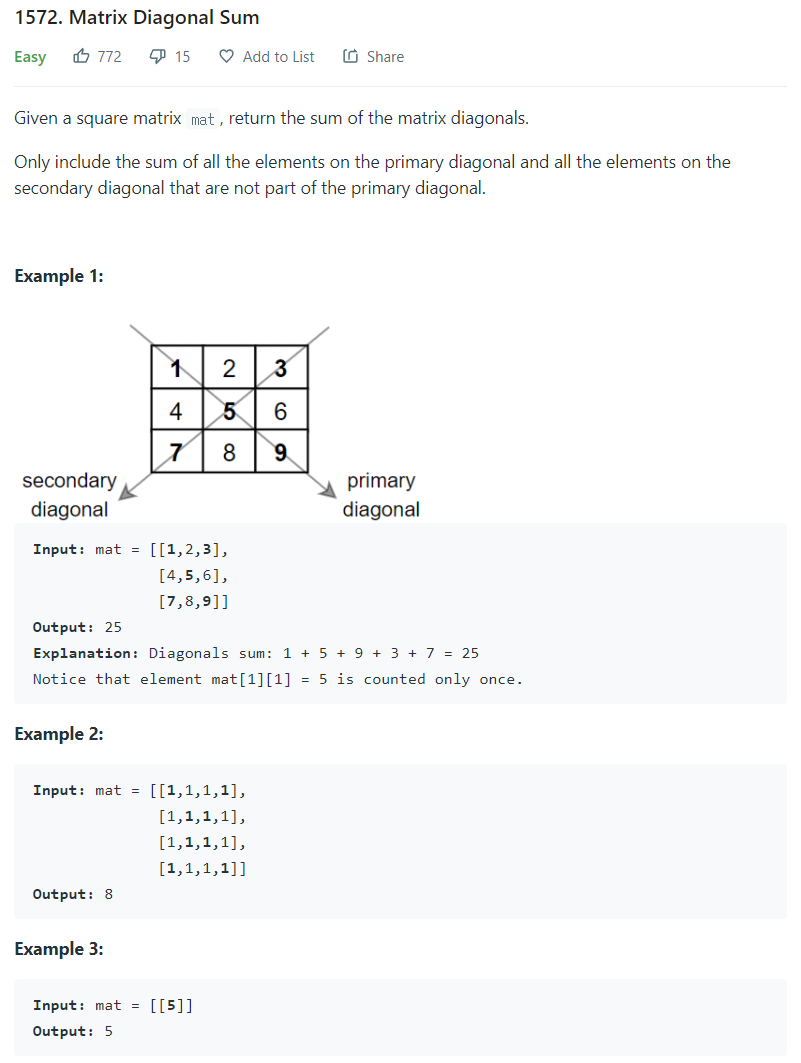 https://leetcode.com/problems/matrix-diagonal-sum/