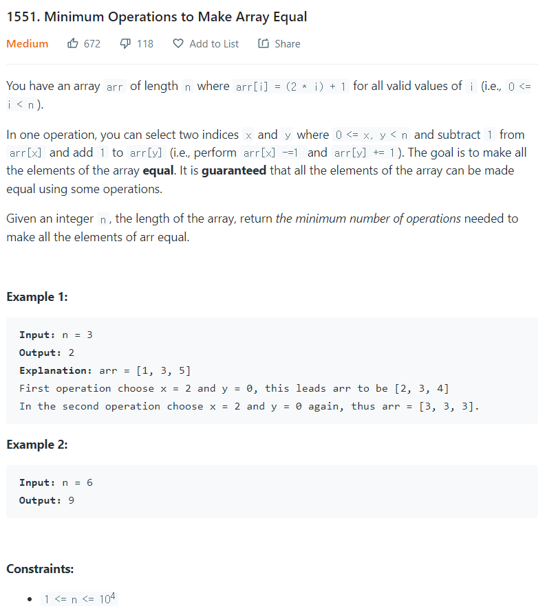 https://leetcode.com/problems/minimum-operations-to-make-array-equal/