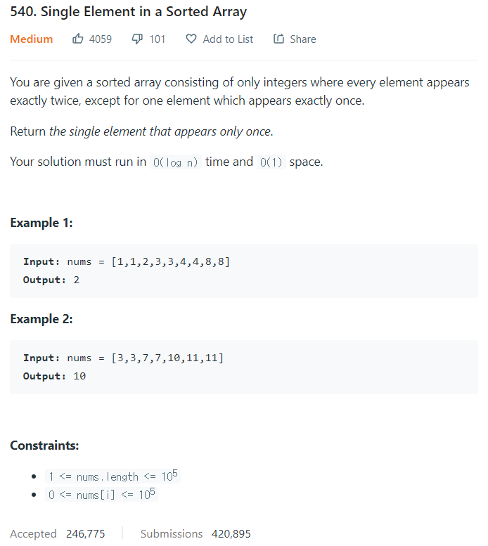 540. Single Element in a Sorted Array 본문