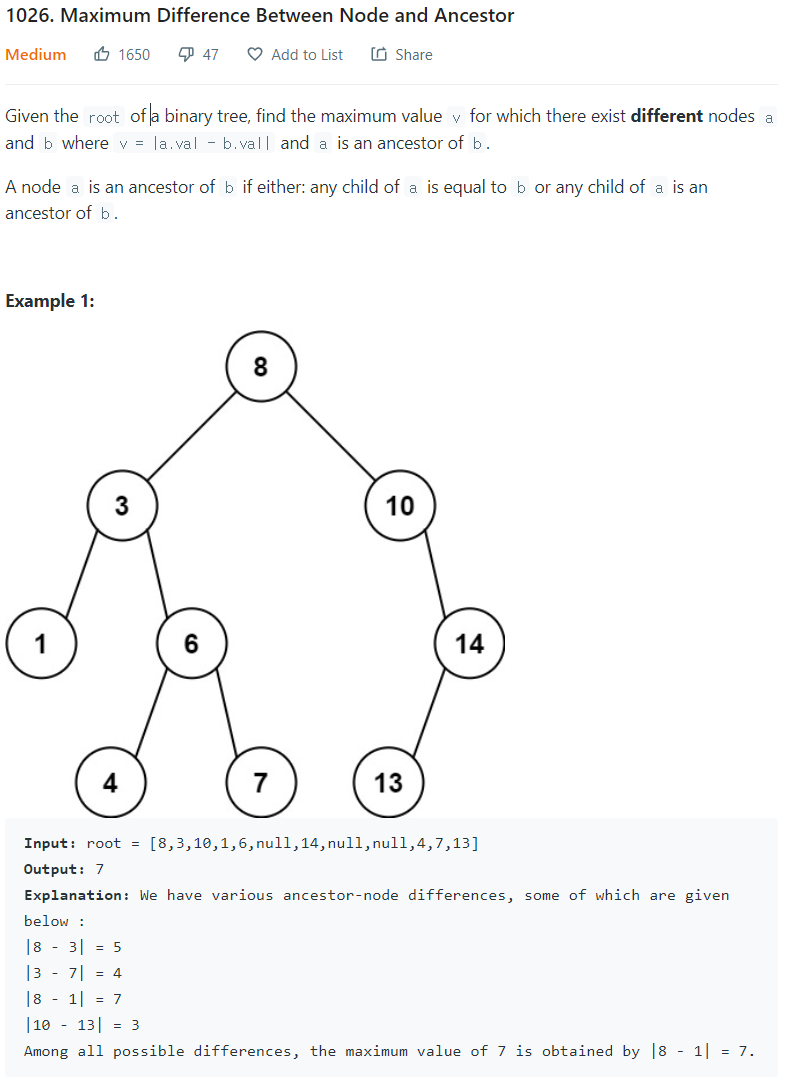 https://leetcode.com/problems/maximum-difference-between-node-and-ancestor/