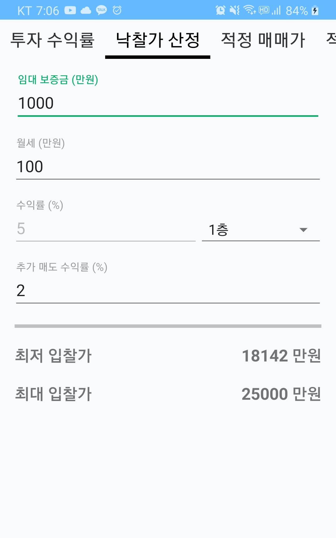 - 임대보증금, 월세, 수익률, 추가 매도 수익률 기반 적정 입찰가를 계산합니다.
