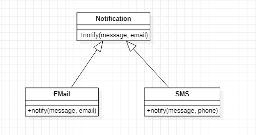 위 예제에는 세 가지 클래스가 있습니다. Notification, EMail, SMS. Email과 SMS 클래스는 Notification 클래스를 상속 받았습니다. Email과 SMS는 message를 Notification의 notify() 함수를 통해서 전달하려는 것입니다.