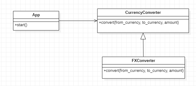 CurrencyConverter 추상 클래스를 추가하고, App은 CurrencConverter 추상 클래스에 의존하면 FXConverter는 CurrencyConverter를 상속 받는 구조로 변경합니다. 기존에는 App에서 FXConverter에 의존하는 화살표가 하나 있었지만 바뀐 디자인에서는 App도 CurrencyConverter에 의존하고, FXConverter에 의존하는 (화살표가 한 방향이 아닌 동시에 CurrencyConverter를 향하는) 의존성 역전 법칙을 준수하는 모양입니다.