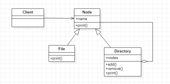 - Directory는 Node를 상속받고 Node 관리하기 위한 nodes가 있습니다. 클래스 다이어그램에서 합성을 통해서 표시합니다. Node 관리용 add(), remove() 함수도 지원합니다.