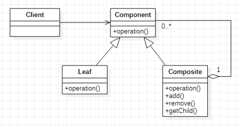- Composite 클래스는 Component 객체 자식들을 유지하고 operation()통해서 작식들에게 전달