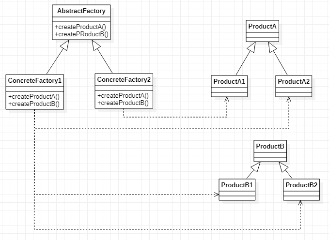 ConcreteFactory1, ConcreateFactory2는 서로 다른 객체의 집합군을 생성한다. AbatractFactory를 상속 받아서 ConcreateFactoryN을 만들어서 다양한 객체의 집합군을 생성할 수 있다. 클라이언트는 복잡한 객체의 생성에 관여하지 않고 팩토리에게 객체의 생성을 맡겨서 객체 생성을 분리시킨다.