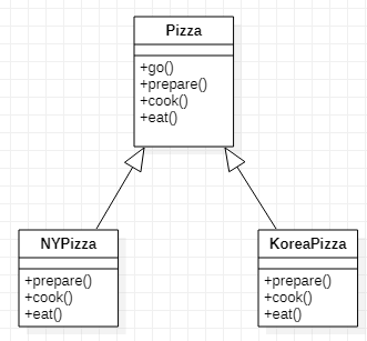Pizza의 go() 함수가 템플릿 메소드(알고리즘 골격)에 해당하고, Pizza를 상속받은 NYPizza, KoreaPizza 클래스가 있습니다. NYPizza는 뉴욕 스타일로 피자를 만들어야 하기 때문에 prepare(), cook(), eat() 함수를 재정의 합니다. KoreaPizza 또한 한국식에 맞게 함수를 재정의 합니다.