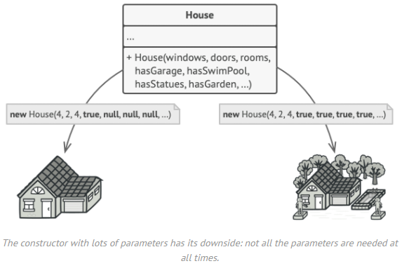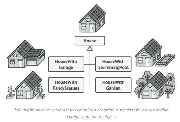 House 객체를 생성하는 방법에 대해서 고민해봅시다. 위의 그림 처럼 단순한 집도 있고, 차고지가 있는 집, 예쁜 조각상이 있는 집, 풀장이 있는 집, 수목이 화려한 집 등등등.. 아주 많은 조건을 가진 집들이 있을 것입니다.
