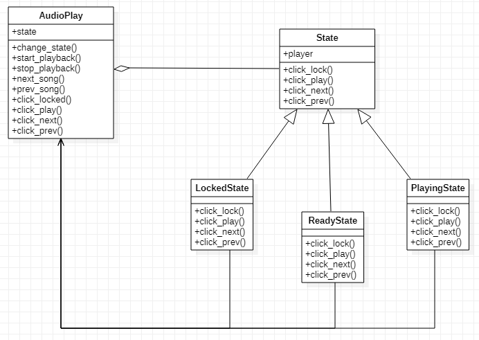 AudioPlayer를 예시로 사용합니다. 상태는 Locked 상태, Ready 상태, Playing 상태가 있습니다. State는 AudioPlay를 백 레퍼런스 하기 위해서 player 레퍼런스를 가지고 있습니다.