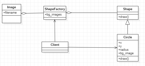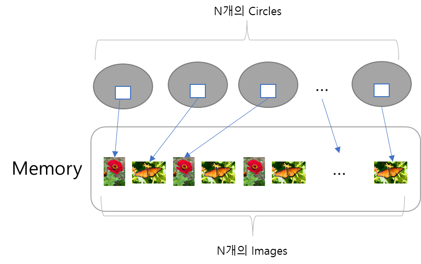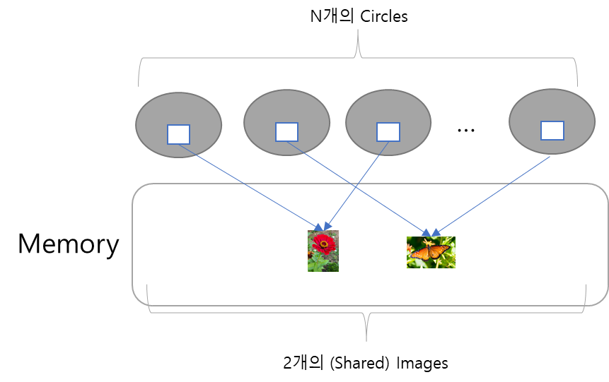 무수한 원을 화면에 그리는 예제를 들겠습니다. 원은 x, y, radius(반경), 백그라운드 이미지 속성을 갖습니다. 수 천, 수 만개의 원을 화면에 그릴 수 있습니다. 백그라운드 이미지는 flower.png, buttery.png 이미지가 될 수 있습니다. 만약 플라이웨이트 패턴을 적용하지 않는 다면 10,000개의 원을 그리기 위해서는 이미지 10,000개를 메모리에 로드해야하는 불상사가 발생합니다. 메모리를 쓸데 없이 많이 소비하는 거죠. 이미지 파일 하나의 사이즈가 1MB이면 10,000개를 메모리에 로드하기 위해서는 10GB 메모리가 필요합니다. PC의 램이 10GB 이하라면 프로그램은 메모리가 부족하여 강제 종료될 것입니다.
