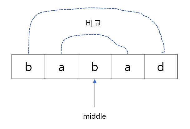 middle 문자를 정하고 왼쪽, 오른쪽 포인터를 정해서 비교해서 동일한 문자면 한 칸씩 이동하면서 회문임을 확인한다.