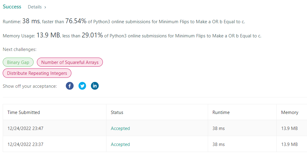 1318. Minimum Flips to Make a OR b Equal to c 본문