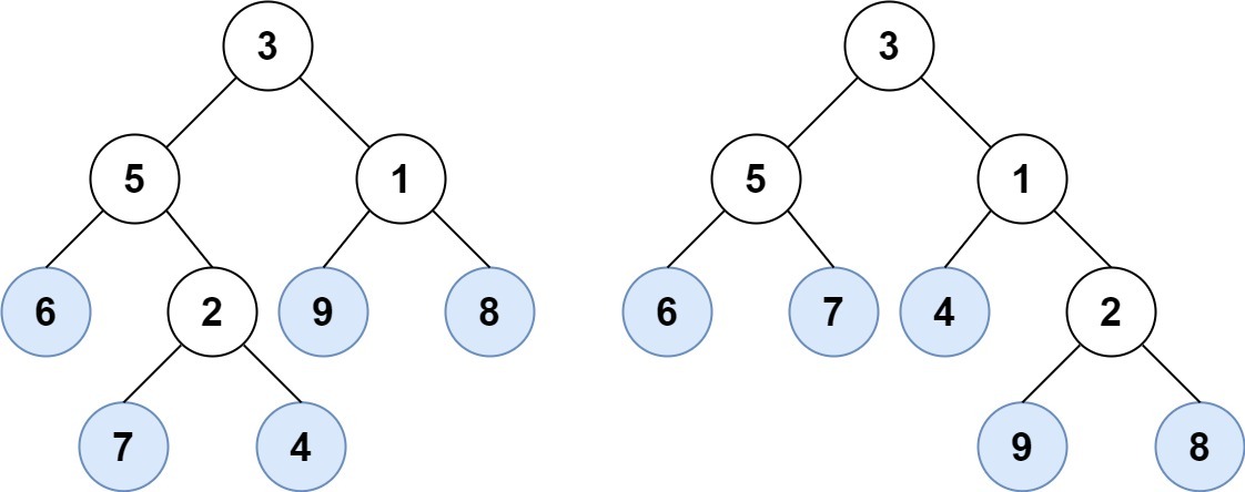 Input: root1 = [3,5,1,6,2,9,8,null,null,7,4], root2 = [3,5,1,6,7,4,2,null,null,null,null,null,null,9,8]