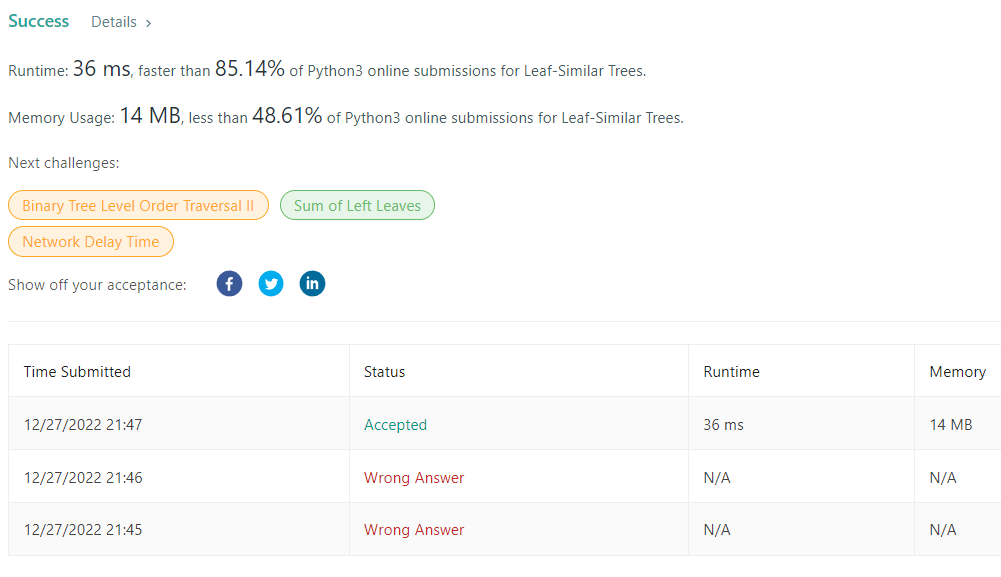 Two binary trees are considered leaf-similar if their leaf value sequence is the same.