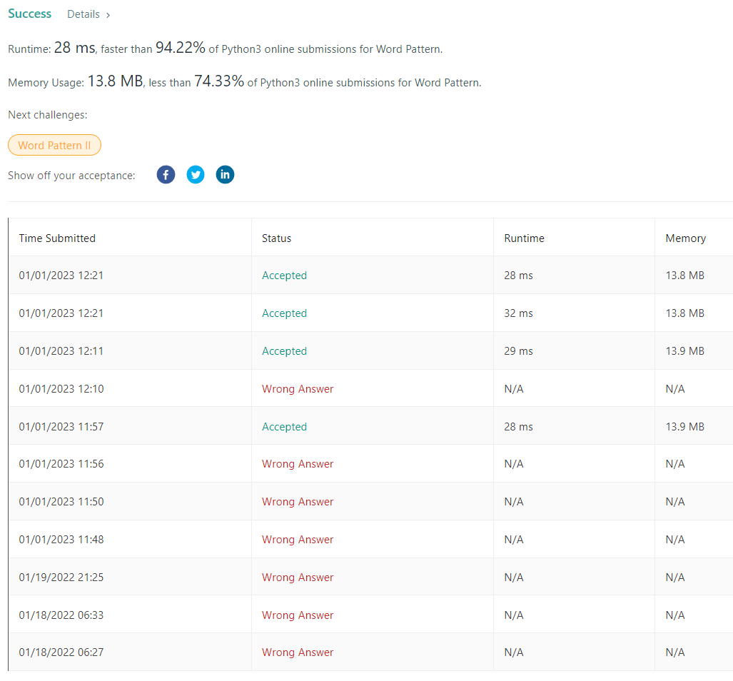 - 패턴->단어 해시, 단어->해시 테이블을 유지