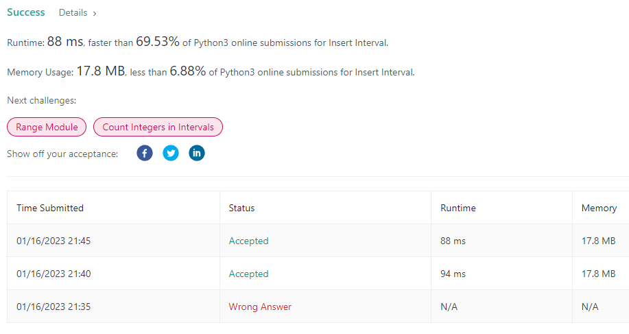 - newInterval에 머지되는 경우에 값들은 최종적으로 min, max를 구해서 새로운 인터벌을 생성