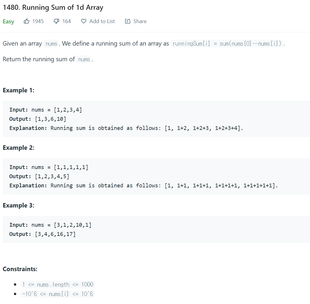 LeetCode 풀이 - 1480. Running Sum of 1d Array 본문
