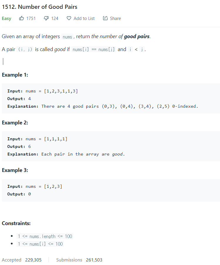 LeetCode 풀이 - 1512. Number of Good Pairs 본문
