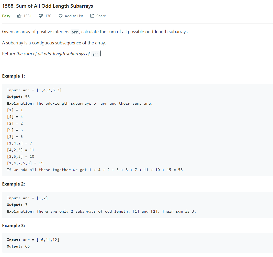 LeetCode 풀이 - 1588. Sum of All Odd Length Subarrays 본문