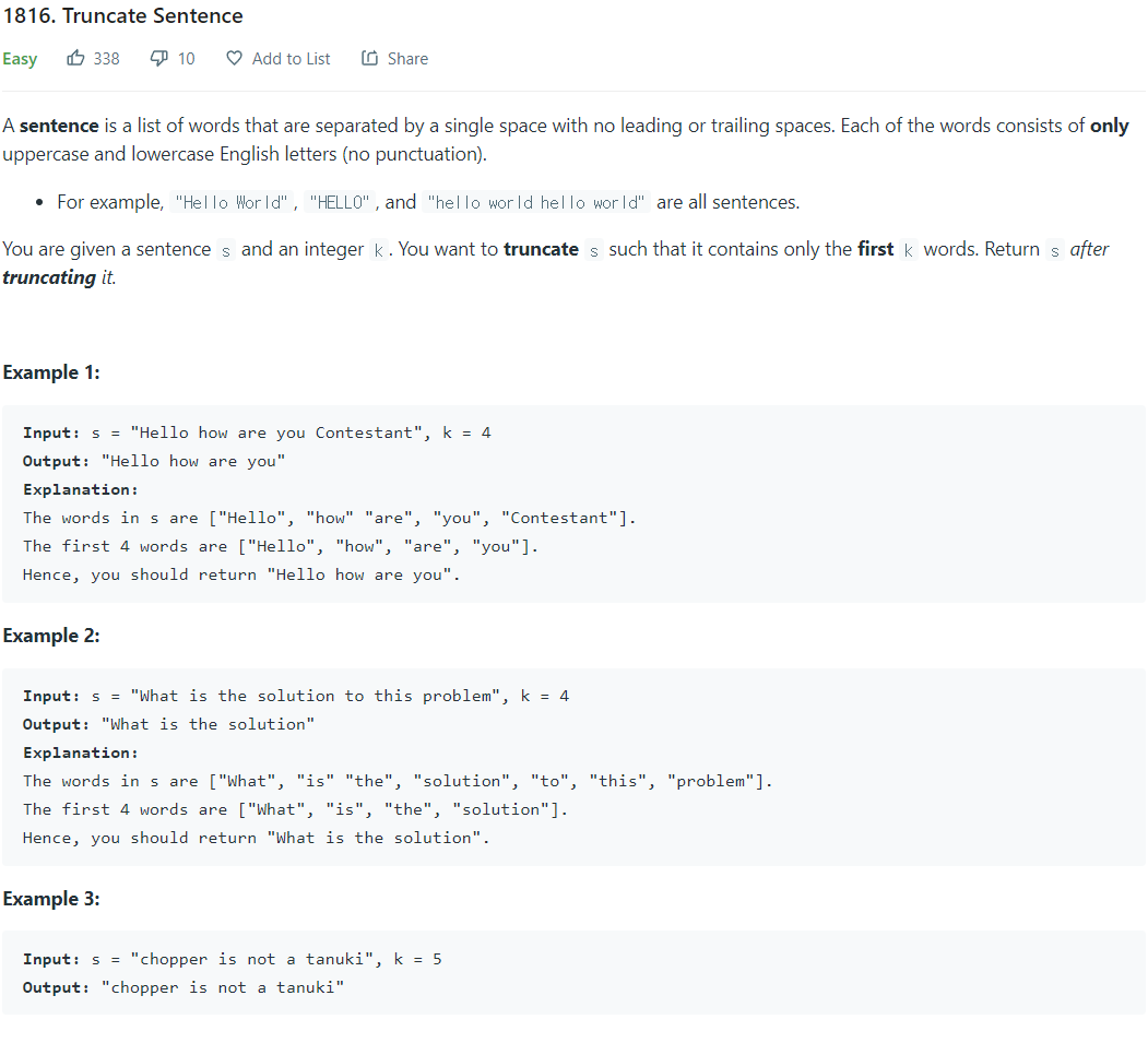 LeetCode 풀기 - 1816. Truncate Sentence 본문
