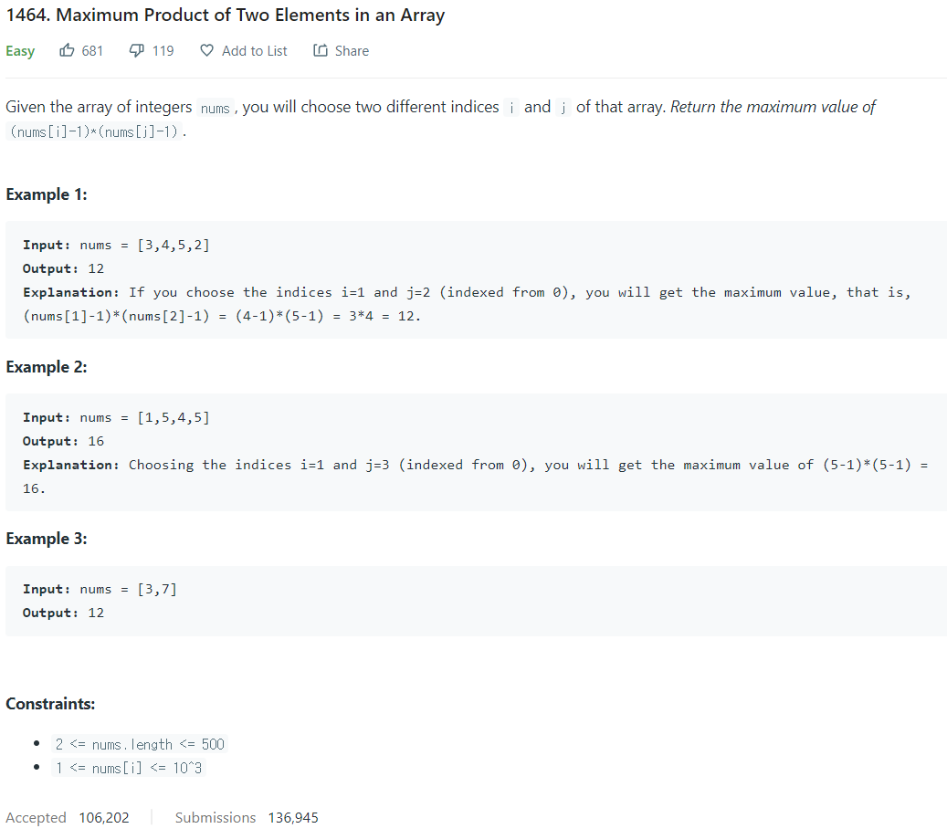 LeetCode 풀기 - 1464. Maximum Product of Two Elements in an Array 본문