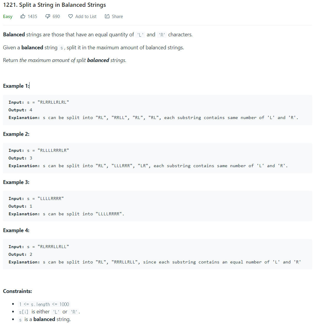 Split a String in Balanced Strings - LeetCode