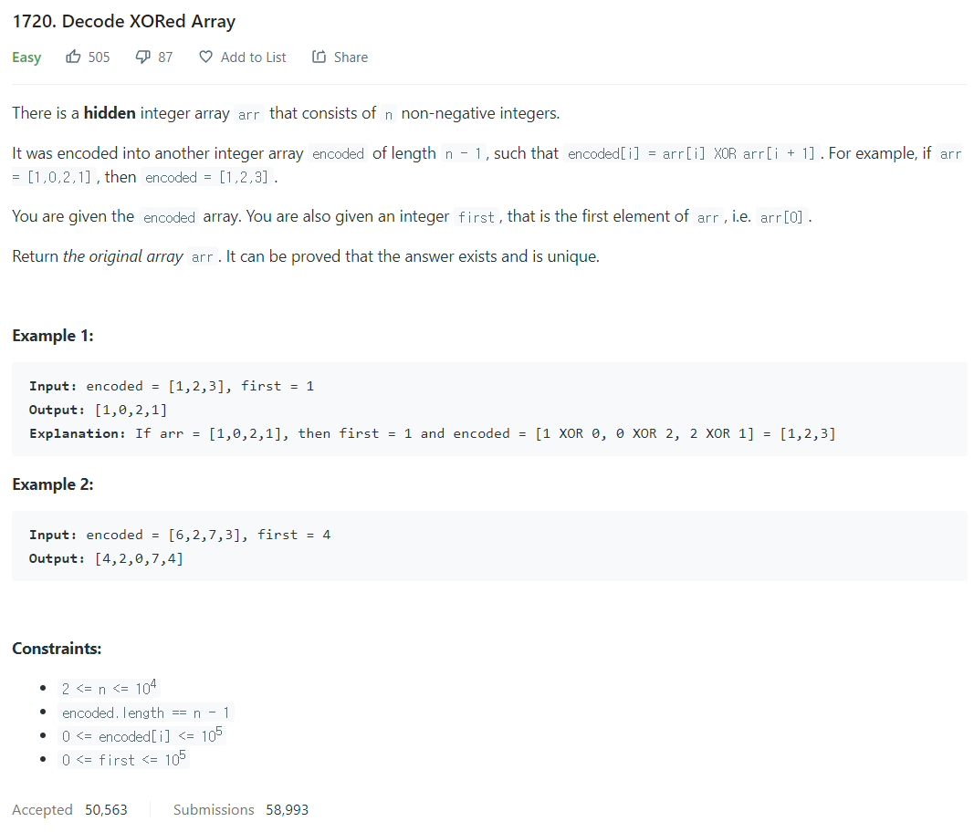 LeetCode 풀기 - 1720. Decode XORed Array 본문