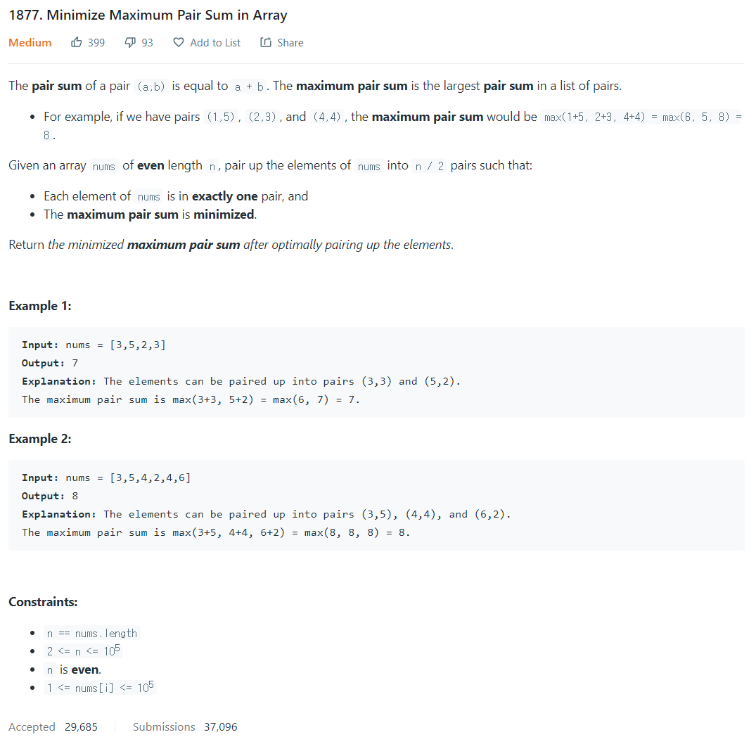 LeetCode 풀기 - 1877. Minimize Maximum Pair Sum in Array 본문