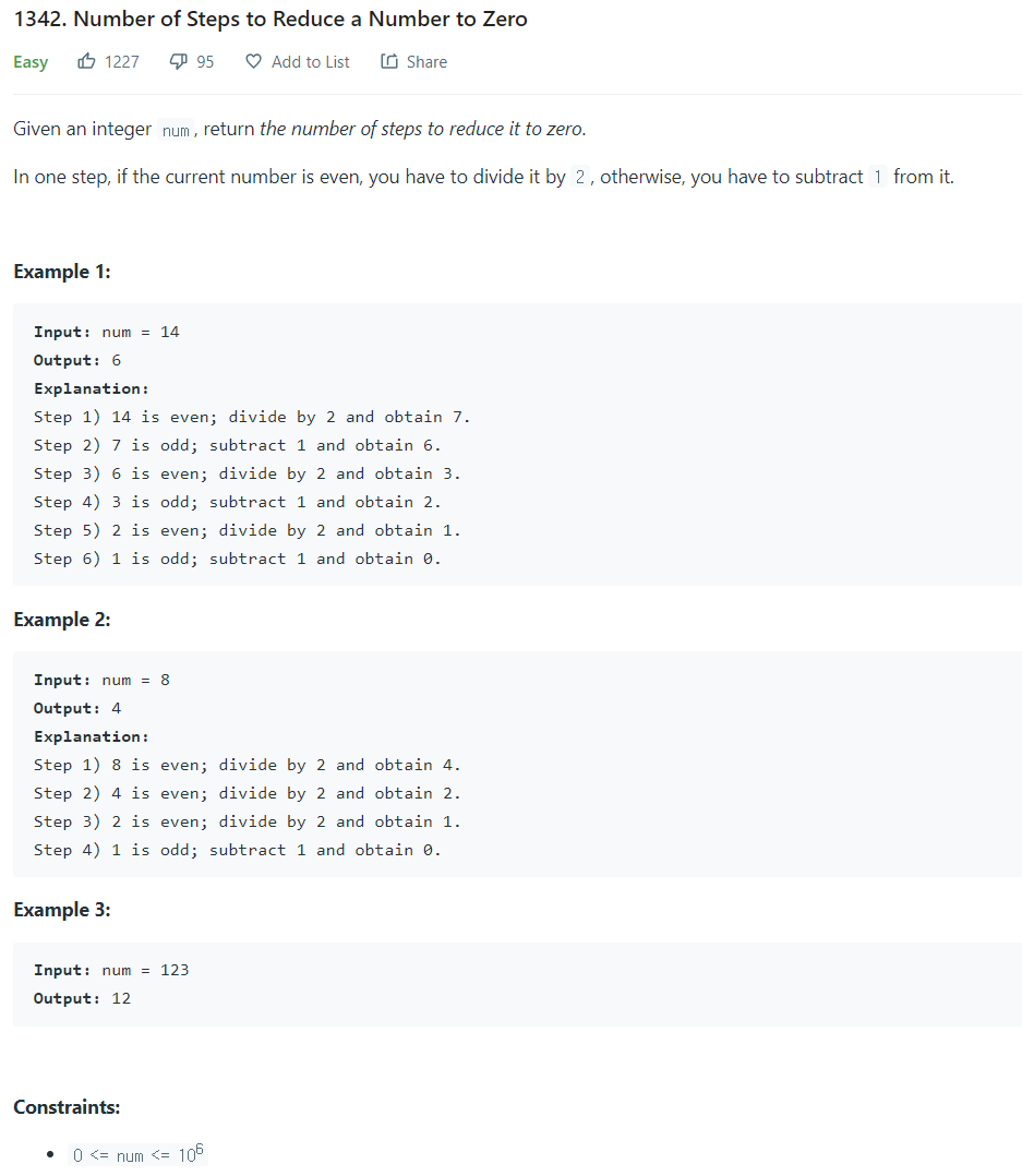 LeetCode 풀기 - 1342. Number of Steps to Reduce a Number to Zero 본문