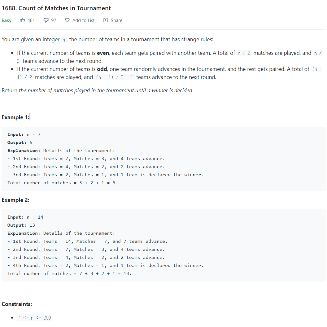 LeetCode 풀기 - 1688. Count of Matches in Tournament 본문